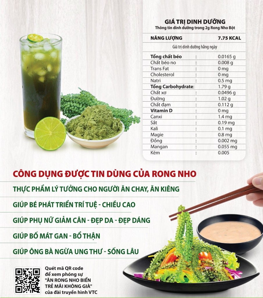 Bột rong nho chứa nhiều chất dinh dưỡng. Các chuyên gia dinh dưỡng đã xác định đây là nguồn dinh dưỡng thiết yếu rất tốt đối trẻ và phụ nữ sau sinh. Dùng bột này nấu cháo cho trẻ dùng rất cho sự phát triển não bộ của trẻ.